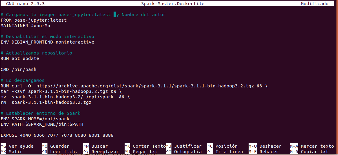 - In: root@juan-SATELLITE-C55-C-1JM:/my-dockerfile# nano Spark-Master.Dockerfile