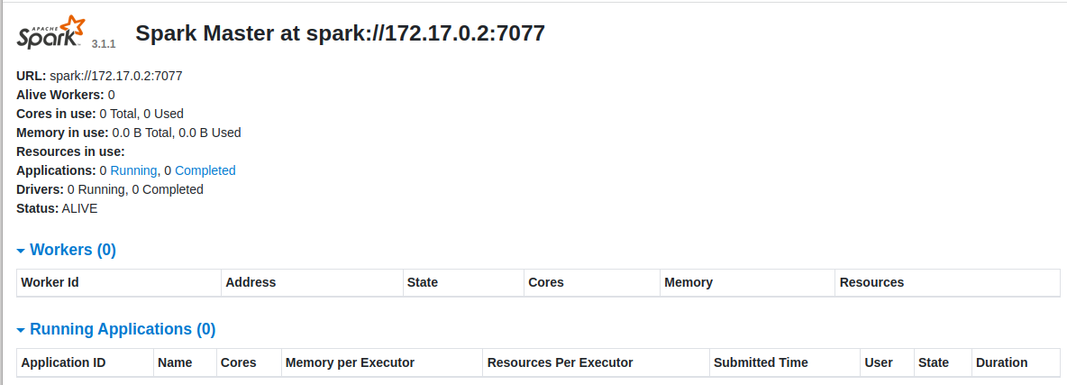 - Out: b7699dc8ce75 spark-master:latest «/bin/sh -c /bin/bash» 6 minutes ago Up 6 minutes 0.0.0.0:4040->4040/tcp, 0.0.0.0:6066->6066/tcp, 0.0.0.0:7077-7078->7077-7078/tcp, 0.0.0.0:8080->8080/tcp, 0.0.0.0:8888->8888/tcp, 8081/tcp infallible_colden