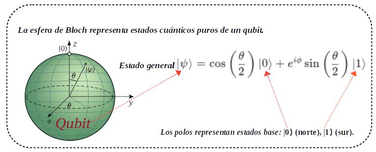 6. La Esfera de Bloch ilustra la representación geométrica de un qubit de estado puro, donde los polos corresponden a los estados base ∣0⟩ y ∣1⟩.