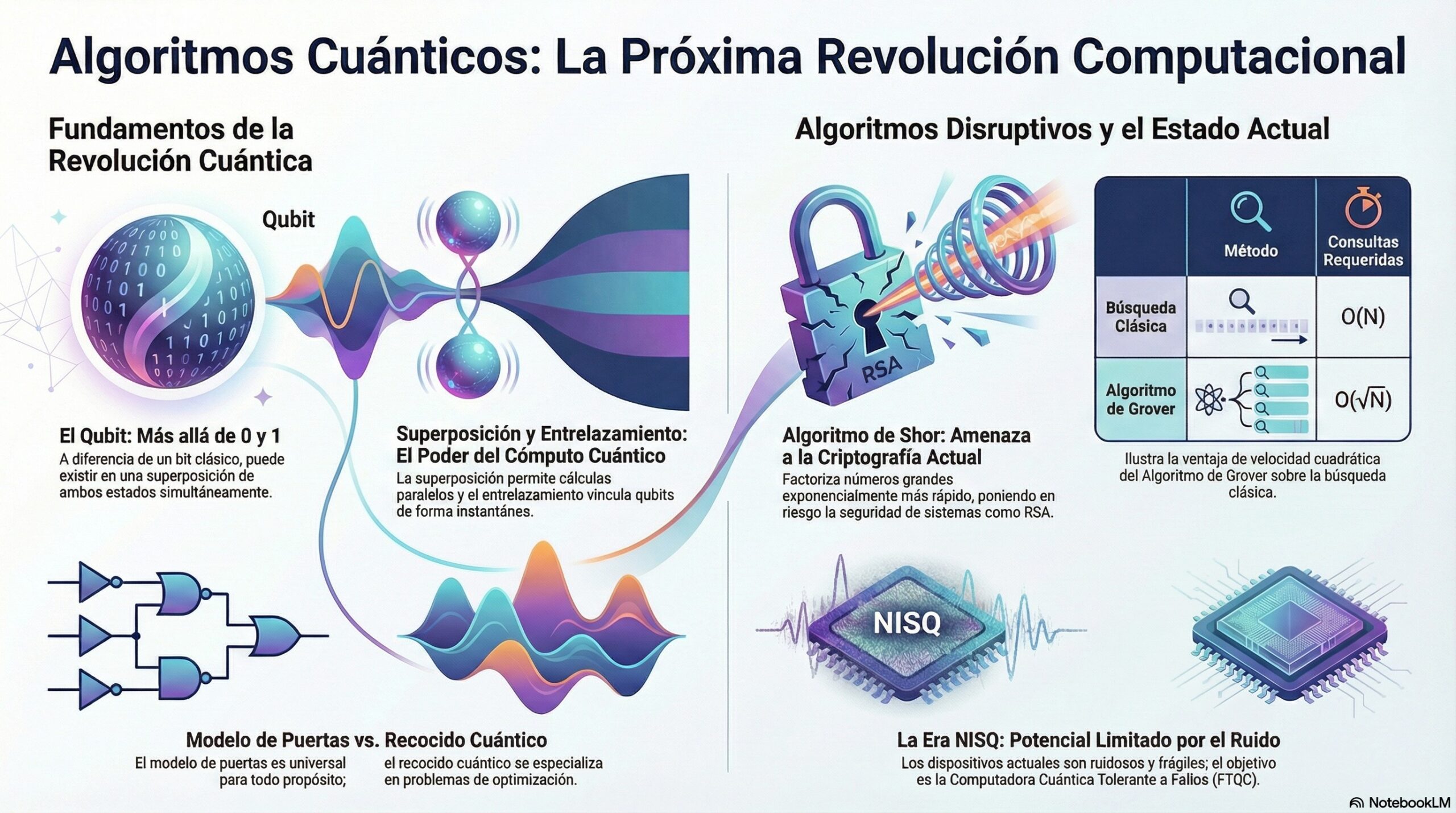 Resumiendo: a Computación Cuántica busca resolver problemas intratables para las máquinas clásicas mediante la explotación de la superposición y el entrelazamiento. El modelo más versátil es el Basado en Puertas, que es el marco para algoritmos revolucionarios: Shor amenaza la criptografía pública actual (factorización rápida), y Grover acelera la búsqueda en bases de datos (ventaja cuadrática). Modelos como el Recocido Cuántico se enfocan en la optimización. Actualmente, nos encontramos en la era NISQ, donde se exploran algoritmos híbridos (como QAOA) para lidiar con el ruido de los dispositivos y avanzar hacia el objetivo final de una Computadora Cuántica Tolerante a Fallos (FTQC).