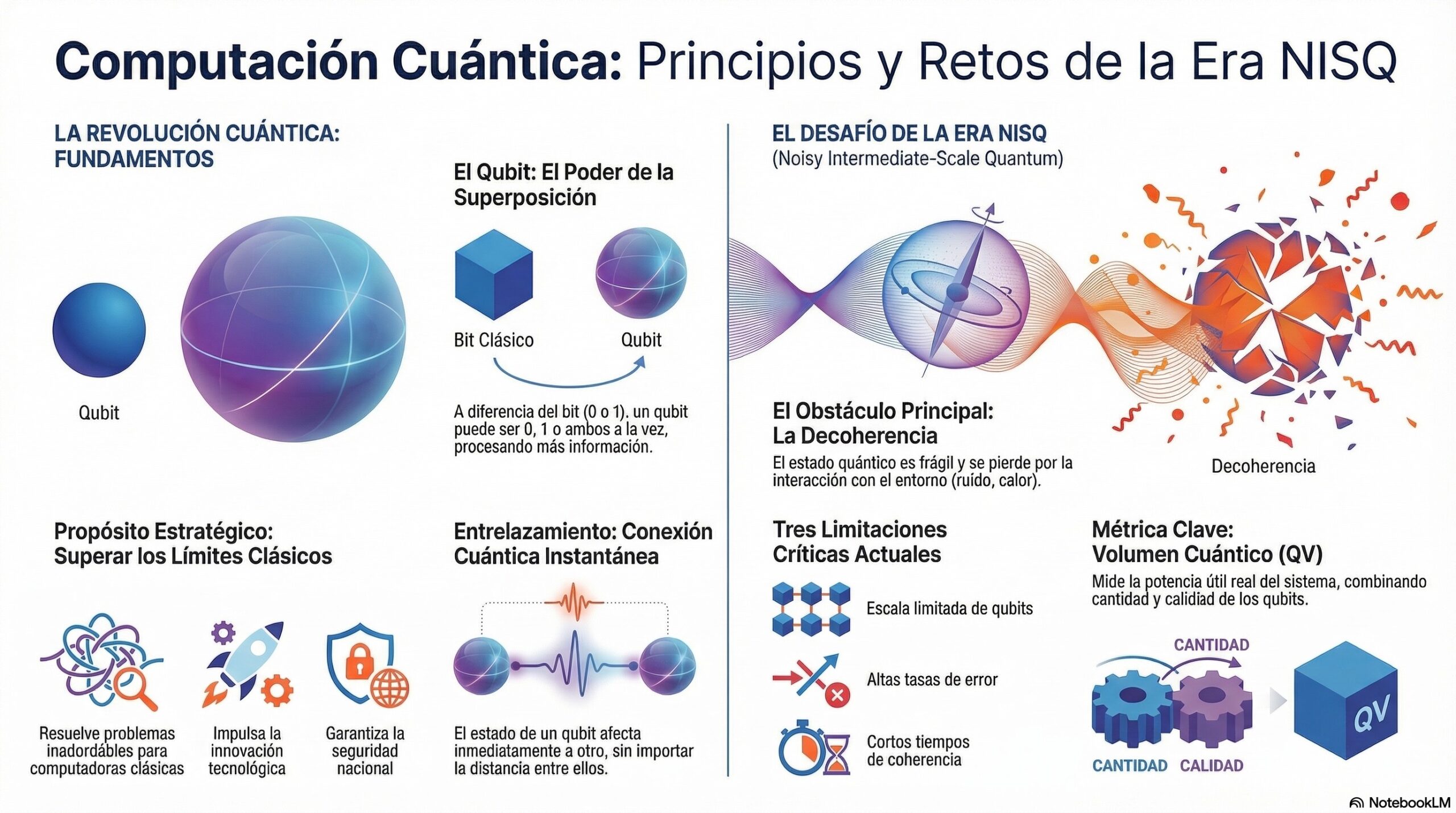 Nota: Esta infografía detalla los fundamentos y obstáculos de la computación cuántica durante la actual era NISQ. Explica que el uso de qubits permite procesar información mediante la superposición y el entrelazamiento, superando así las capacidades de la informática tradicional. Sin embargo, el sector enfrenta el gran reto de la decoherencia, donde factores externos como el ruido o el calor interrumpen los procesos. Para medir el rendimiento real frente a estas limitaciones, se utiliza el volumen cuántico, una métrica que equilibra la cantidad y calidad de los componentes. En última instancia, el objetivo es resolver problemas complejos que impulsen la innovación tecnológica y refuercen la seguridad nacional.