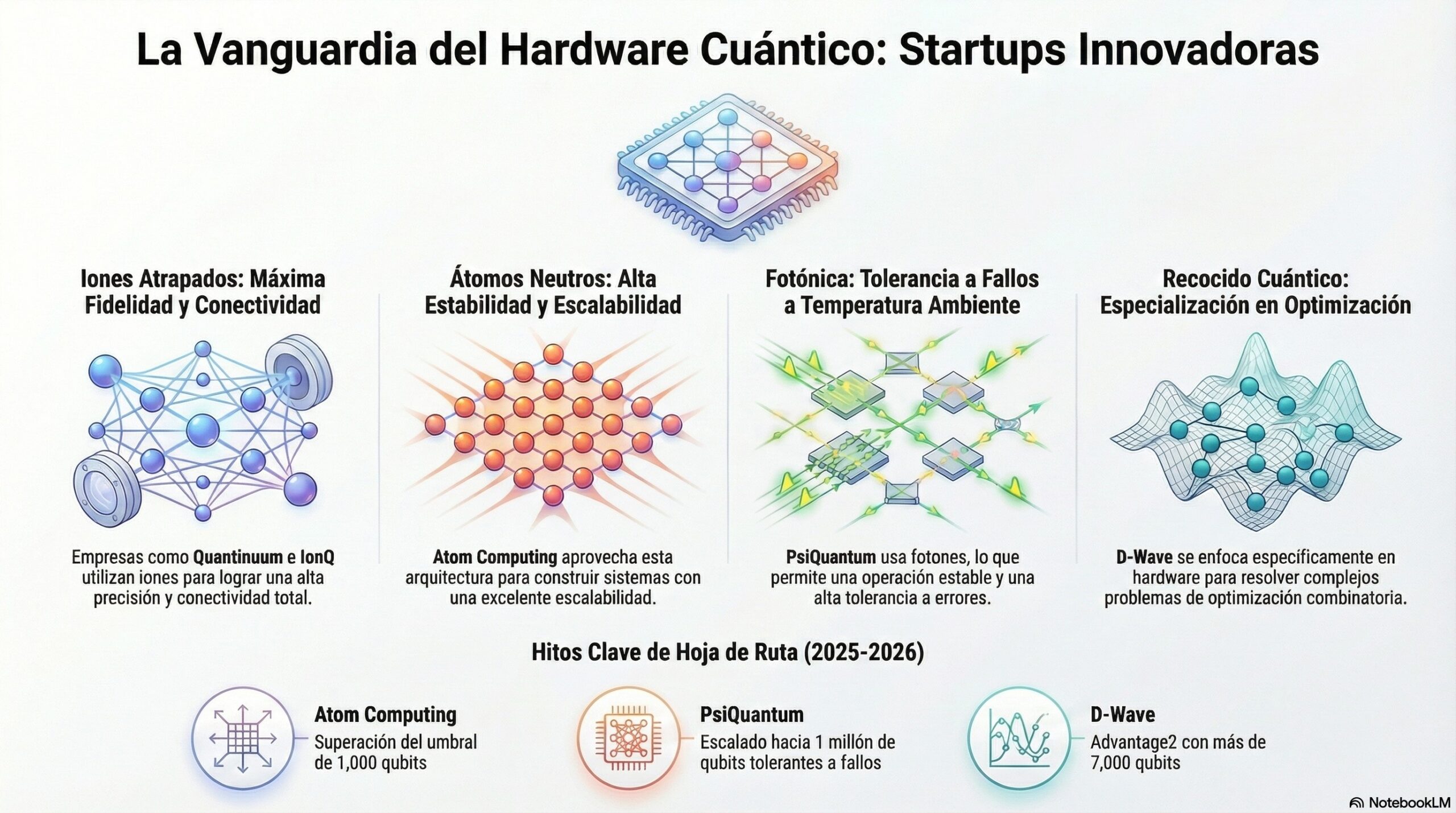 Nota: La imagen presenta una Infografía que describe el papel de las startups y especialistas en hardware en el desarrollo de arquitecturas cuánticas alternativas. Esta Infografía se enfoca en cómo estas empresas buscan resolver los desafíos de fidelidad y escalabilidad de manera innovadora. La información se organiza por empresa, listando su arquitectura primaria (como Iones Atrapados o Cúbits de Gat) y la ventaja tecnológica clave que ofrece cada una. Además, se indican los hitos de la hoja de ruta que las compañías esperan alcanzar en los próximos años, incluyendo métricas como el Volumen Cuántico o el número de cúbits. La Infografía es un resumen de la competencia en hardware cuántico y sus objetivos a corto y mediano plazo.
