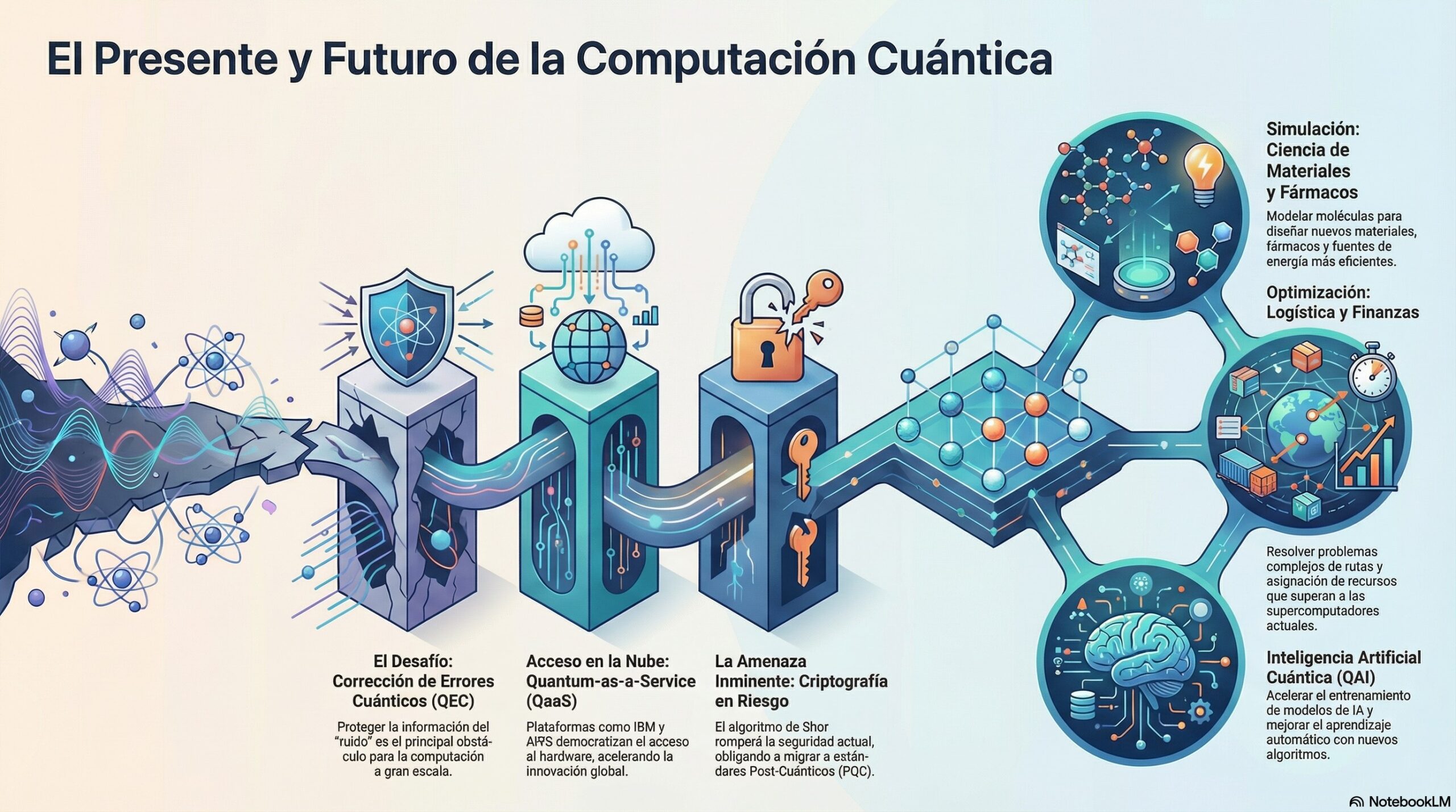 Discreción: Esta infografía detalla el panorama actual y las perspectivas venideras de la computación cuántica, subrayando que la corrección de errores es el obstáculo técnico más crítico a superar. El contenido explica que el acceso remoto mediante la nube está permitiendo que diversas industrias experimenten con este hardware avanzado sin necesidad de poseerlo físicamente. No obstante, se advierte sobre una amenaza a la ciberseguridad, ya que la potencia de estos sistemas podría vulnerar los métodos de cifrado tradicionales. Por otro lado, el impacto positivo se reflejará en la simulación científica, permitiendo el descubrimiento de fármacos y nuevos materiales con una precisión sin precedentes. Finalmente, la integración con la inteligencia artificial y la optimización logística prometen resolver desafíos complejos que las supercomputadoras convencionales no pueden procesar eficientemente.