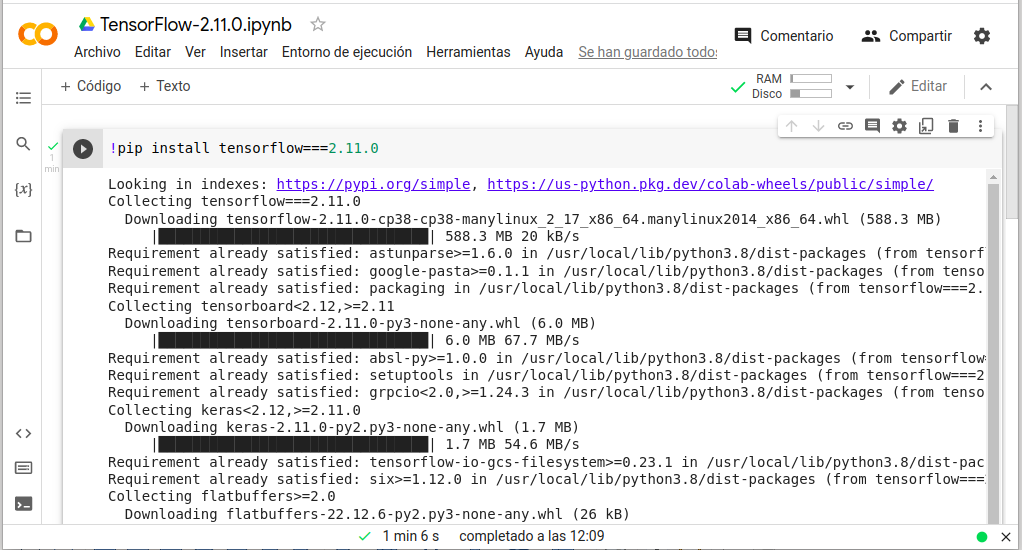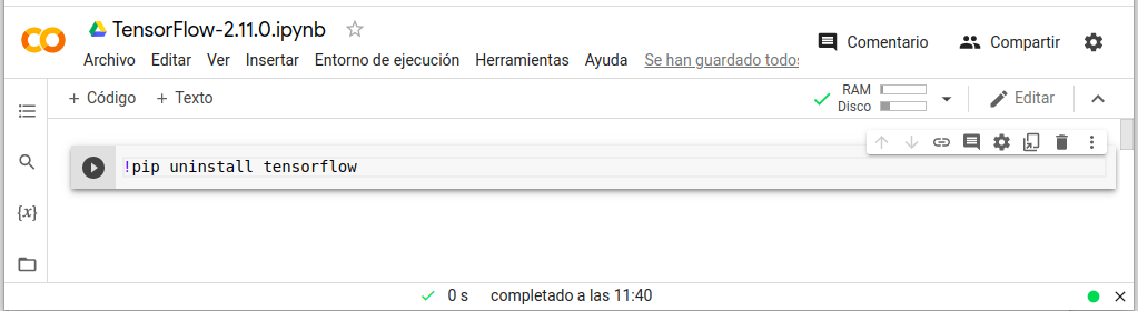 Nota: Desinstalamos la versión anterior si la tenemos instalada y instalamos TensorFlow-2.11.0 la ultima en este momento, verificar la versión de TensorFlow instalada en Google Colab.