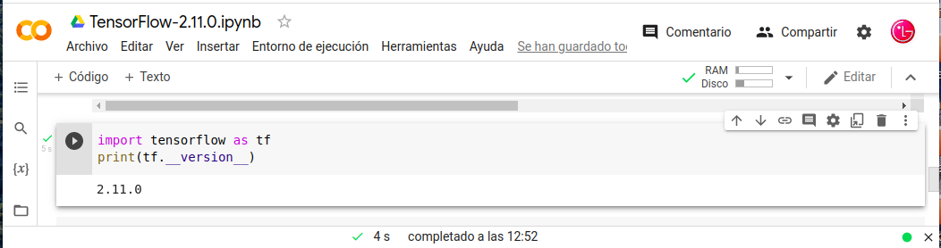 Nota: (Google Collaboratory (Colab) , es un servicio gratuito en la nube alojado por el propio Google para fomentar la investigación en Machine Learning e Inteligencia Artificial una interesante herramienta en un entorno colaborativo).