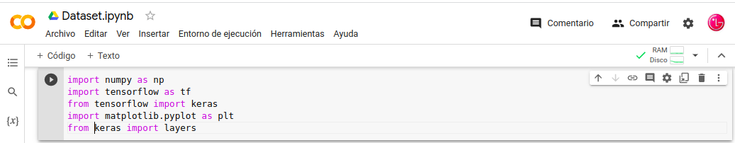 - Lo primero cargamos las librerías necesarias, “numpy” , “ tensorflow” , “ keras” , “matplotlib”.