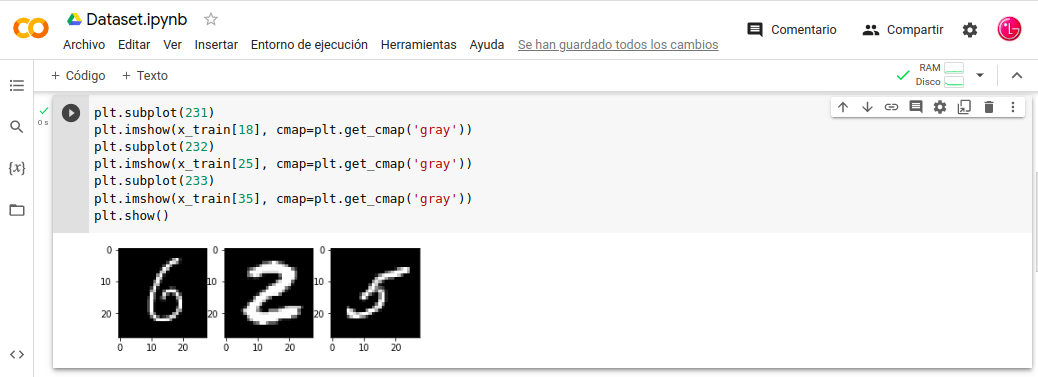 Nota: Podemos visualizar el conjunto de datos-mnist; por supuesto después de descargar datasets.mnist y usado como estructura de datos el Array-Multidimensional de NumPy, para ello utilizaremos la librería auxiliar Matplotlib podemos cargar tres imágenes a modo de ejemplo.