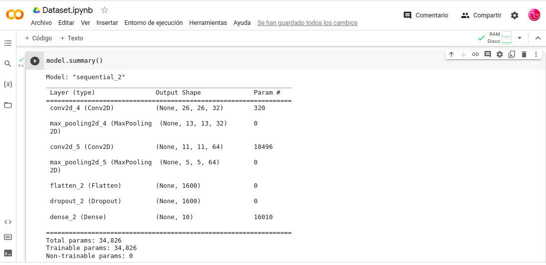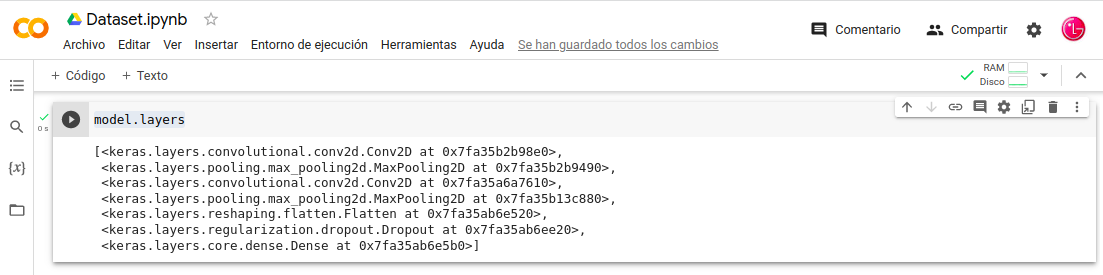 Nota: veremos el resumen del de este Modelo sus capas conv2d con sus capas de pooling2d correspondiente y atraves de model.layers el listado de todas las layers mas detallado.