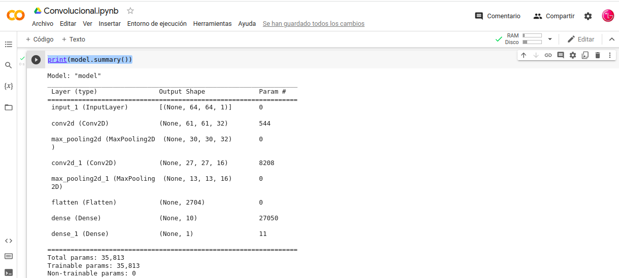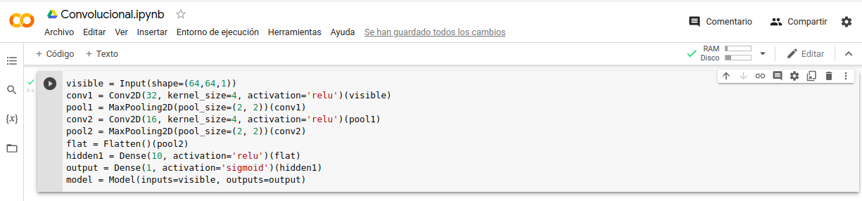 . Pasemos a la generación de la Network-Neuronal-Convolucional para la clasificación de imágenes, usaremos la API funcional en Keras, en el Modelo usa imágenes de 64×64 en blanco y negro como entrada “Input(shape=(64,64,1)” se compone de dos capas convolucionales y de agrupación o lo que es lo mismo “Conv2D y MaxPooling2D” como extractores de características, a continuación una capa-oculta completamente conectada para interpretar las características “hidden=Dense”, y por ultimo una capa-salidad con activación sigmoidea.