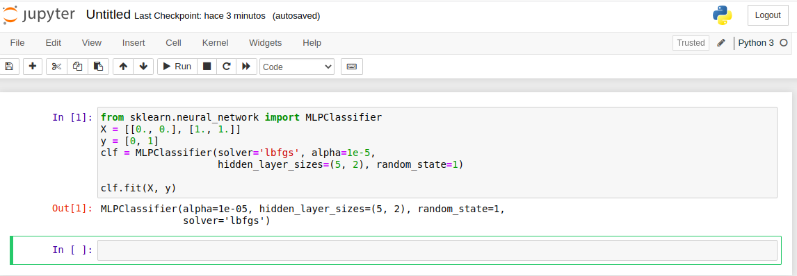 Class MLPClassifier implementa un algoritmo de PerceptrónMulticapa (MLP) que entrena usando Backpropagation .MLP entrena en dos matrices: matriz X de tamaño (n_samples, n_features), que contiene las muestras de entrenamiento representadas como vectores de características de punto flotante; y matriz y de tamaño (n_samples), que contiene los valores objetivo (etiquetas de clase) para las muestras de entrenamiento.