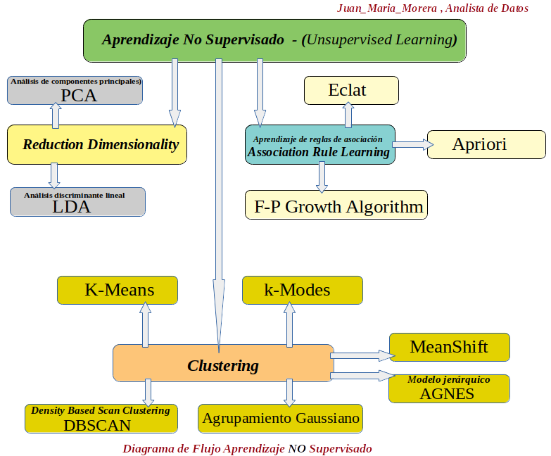 - -. En esta otra parte del diagrama vemos claramente los Algoritmos de Clustering como (Agrupamiento Gaussiano) , (K-Means) , (AGNES) , (MeanShift) , (DBSCAN) , (K-Modes).
