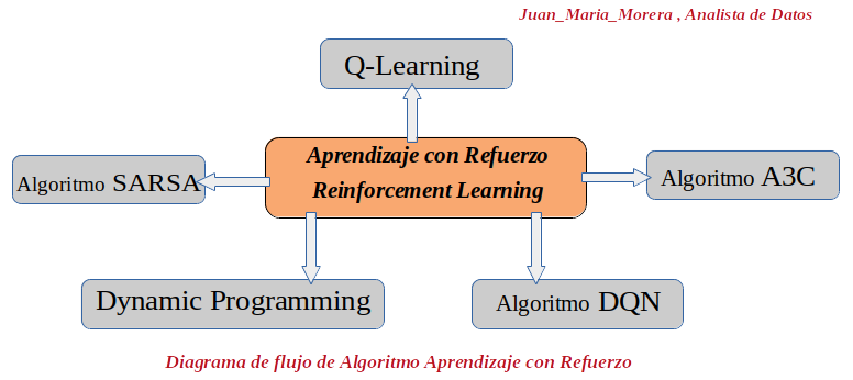 - -. En este diagrama se aprecia claramente los Algoritmos de Aprendizaje con Refuerzo tenemos. (SARSA) , (DQN) , (Dynamic Programming) , (Q-Learning) , y por ultimo un algoritmo usado en un Brazo Robotico (A3C) .