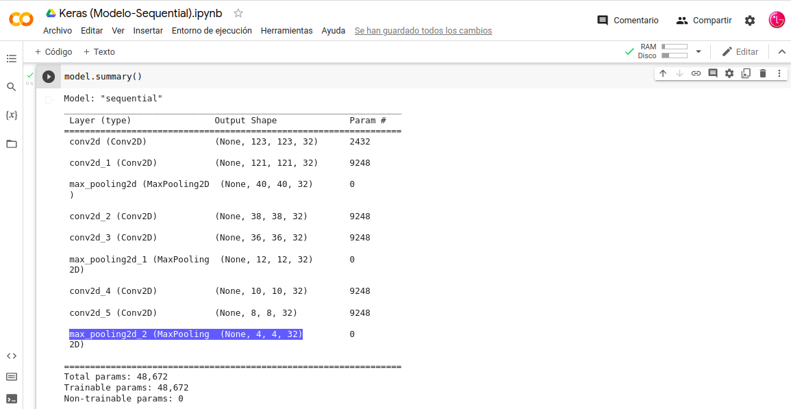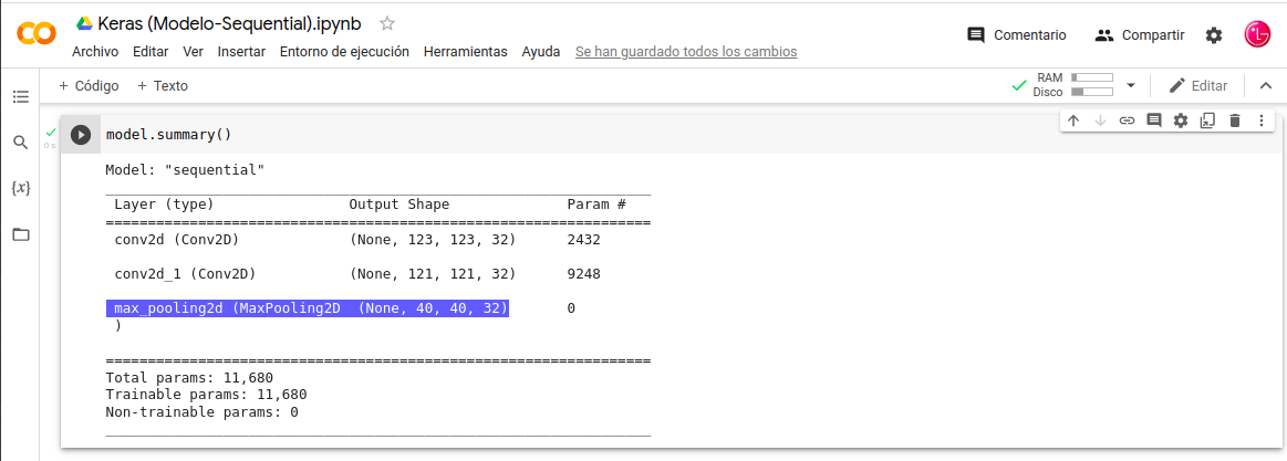 Nota: La respuesta capa MaxPooling2D “Agrupación-Redución” es “40,40,32” continuamos reduciendo la resolución.